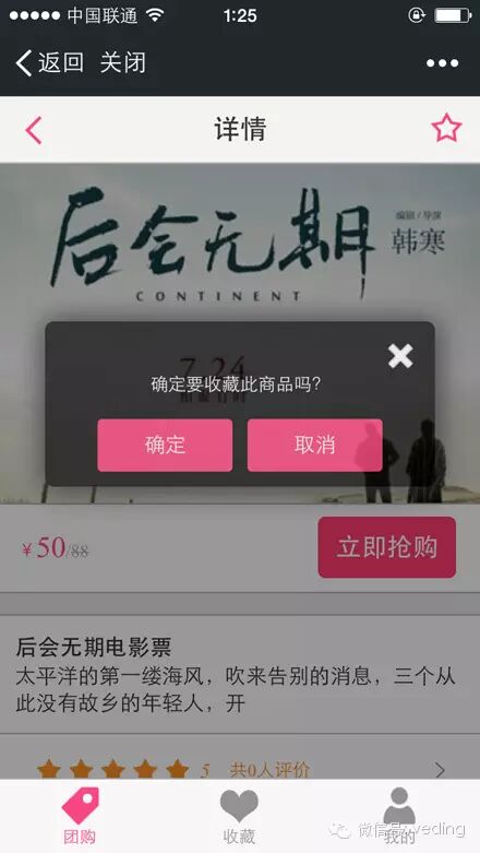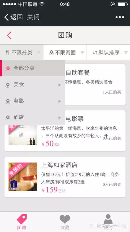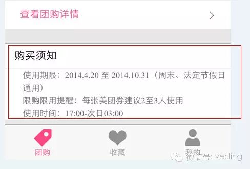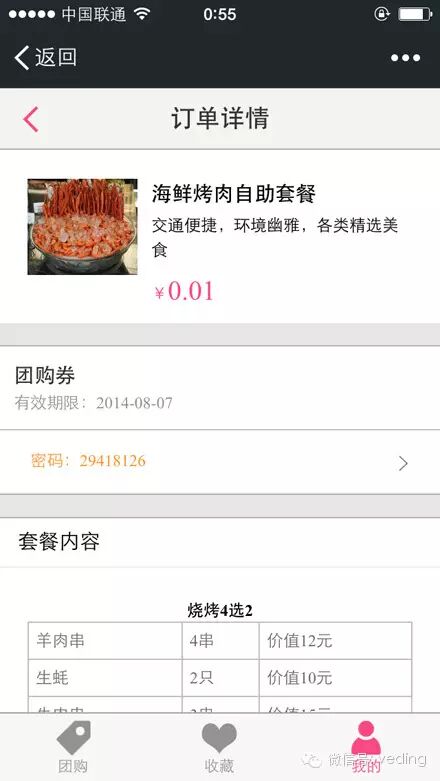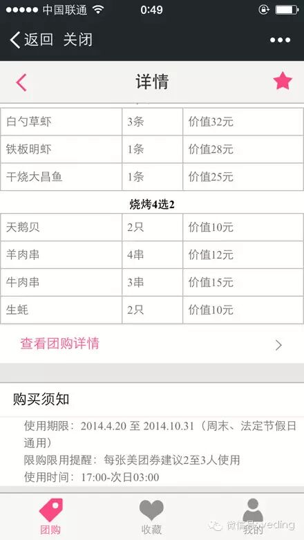 如果你对某个团购套餐感兴趣,可以将其收藏起来,点击商品套餐详情的右上角空心五角星进行收藏,如下图所示: 通过点击底部导航菜单可以查看收藏的店铺,如下图所示: