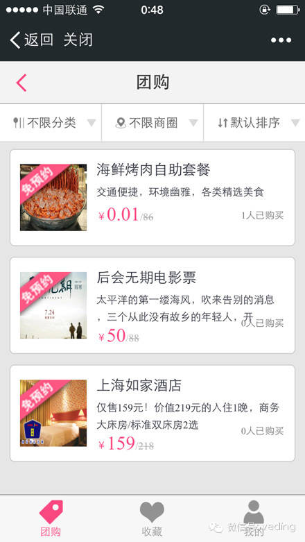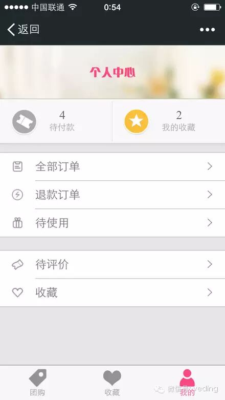 【顾客操作流程】 微团购的界面如何,顾客是如何来进行团购的呢?微团购的界面与以往的微信点单界面不同,界面清新时尚,后台操作简单。界面主要分为:团购、收藏、个人中心三大板块,界面如下图所示: