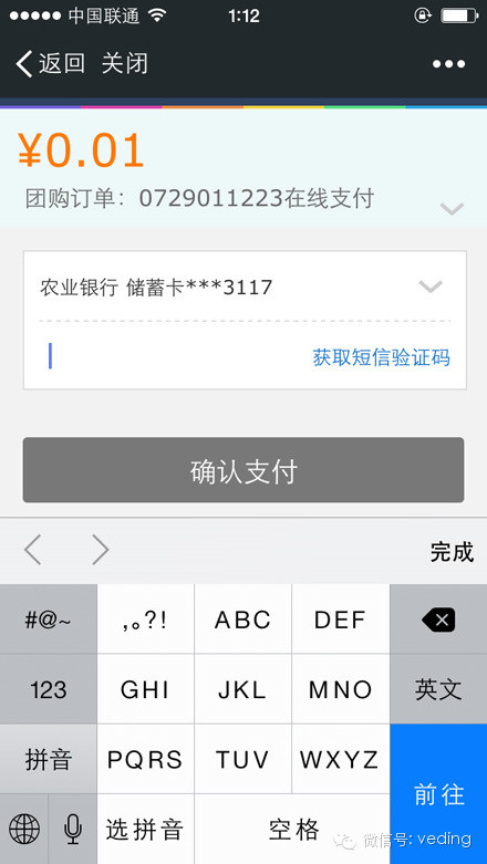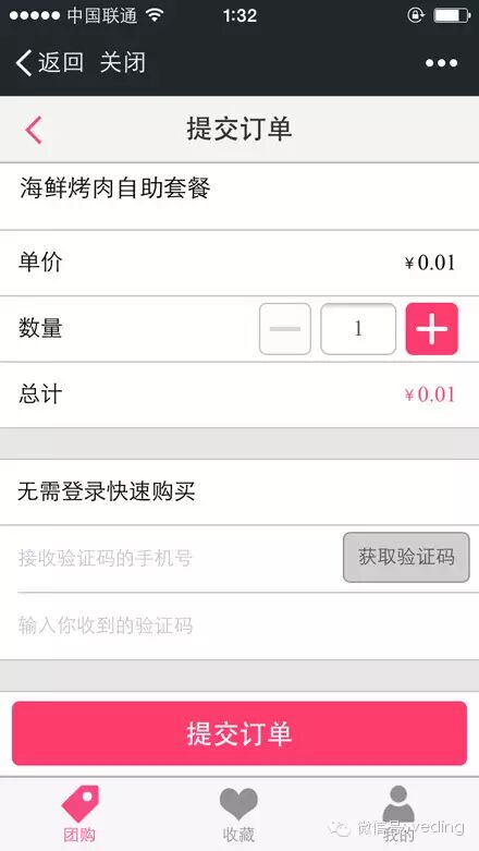 (4)用户点击上面的立即抢购按钮就可以进入提交订单的页面,用户输入手机号码获取短信验证码填入即可(前提是商家在微订后台购买了短信才可以的哦~)如下图所示: