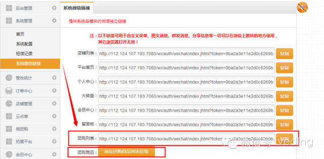 (2)除了微信设置中的回复设置可以进入微团购,还可以直接通过系统管理里面的“系统微信链接”中获取到团购列表链接,和团购套餐链接,如下图所示:
