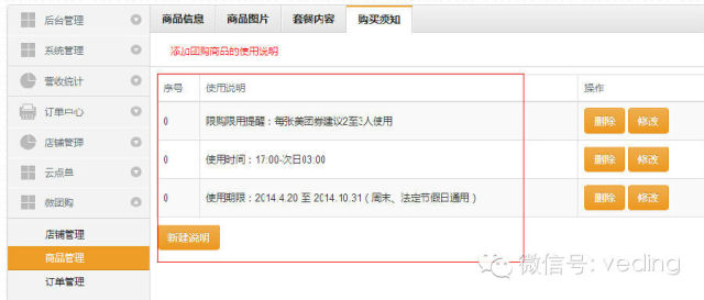 (3)使用说明即购买须知,一行表示一条说明,如下图所示: