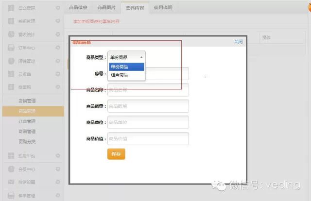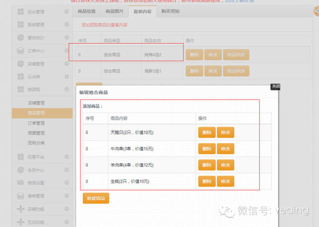 (2)完善套餐内容,一般套餐不只是一种商品,很多情况下是有多种商品组合成的,因此套餐又分为单份商品和组合商品构成,例如电影票一般就属于单份商品,而自助餐商品一般是由组合商品构成的,如下图所示: