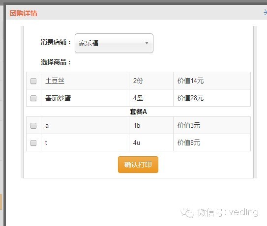 商家选择打印订单的时候可以对订单套餐进行选择性的打印,可以选择该套餐所在的店铺以及用户选择的商品套餐,如下图所示: