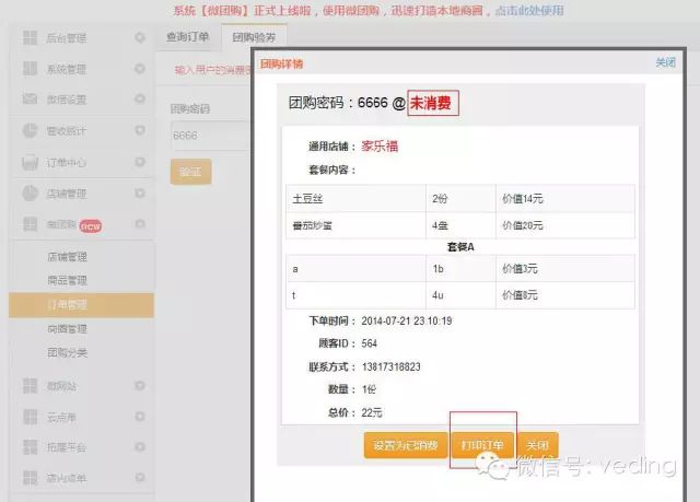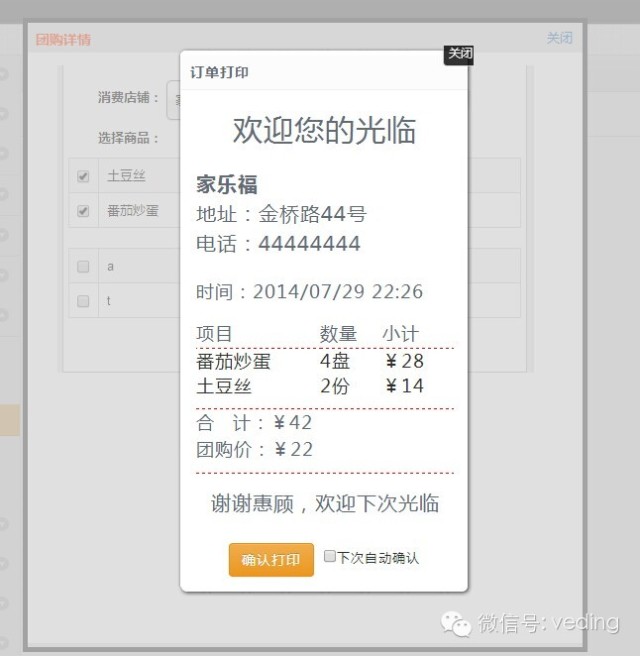 确认打印就可以完成团购订单的打印了,如下图所示: