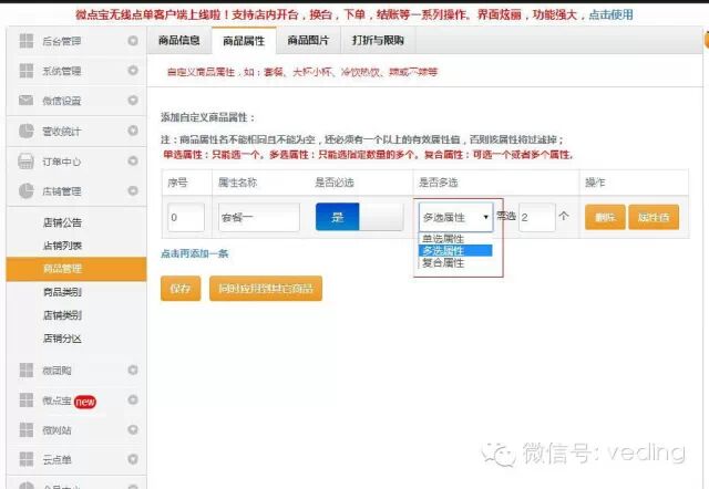商家需要在“店铺管理”功能板块,找到商品管理,新建商品或者修改商品,进入“商品属性”界面新建属性,新建商品属性的时候选择“是否多选”,如下图所示: