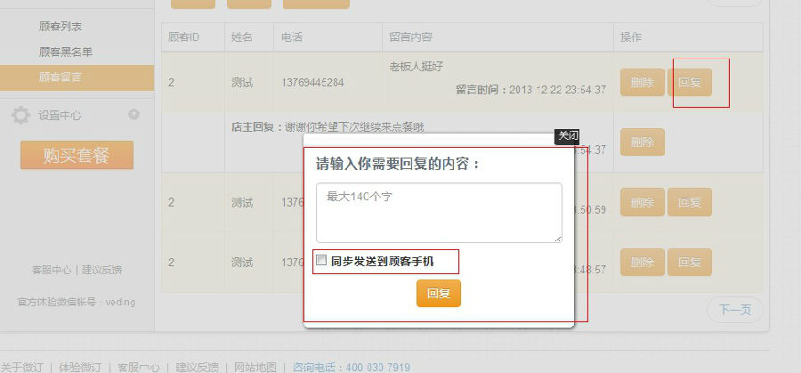 3、商家点击回复可以在弹窗里面给顾客回复留言,并且勾选“同步发布到顾客手机”,则顾客的手机也能接收到商家的回复(短信功能必须购买短信条数)