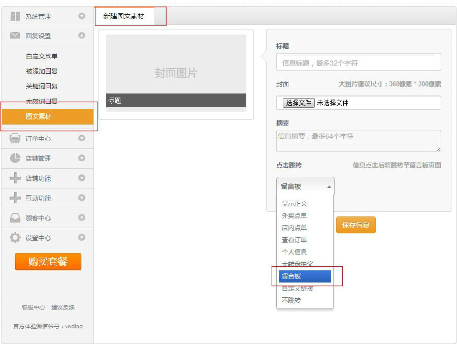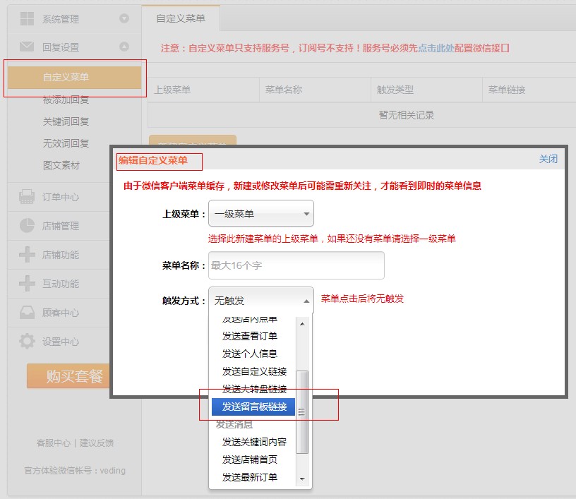 具体使用步骤如下: 1、商家在微订系统后台“顾客中心”——“顾客留言” 进行“留言设置” 留言板支持顾客留言短信通知商家,选择开启此项即可。 商家可在欢迎信息、功能导航信息、店铺首页等三个地方显示留言板入口。同时还支持自定义菜单、自定义图文信息跳转到留言板页面,如下: