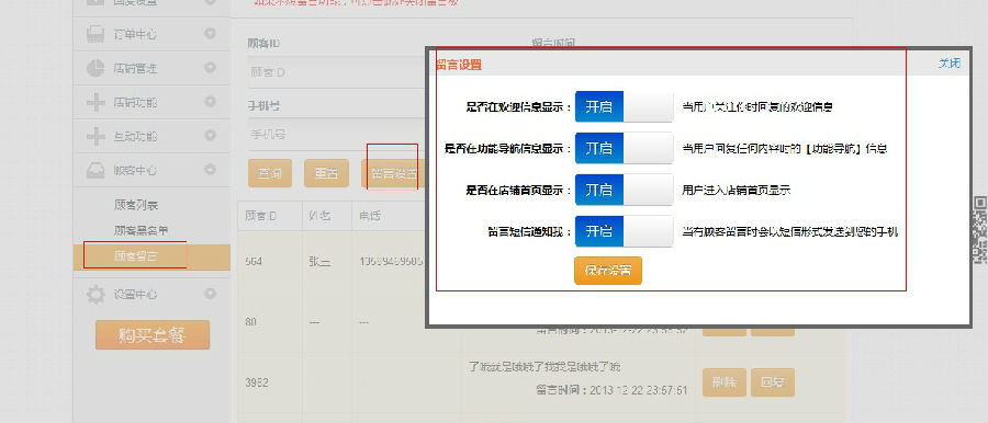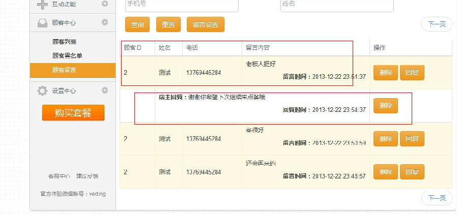 2、商家在后台可以查看到顾客的留言,并且能删除或者回复留言内容。