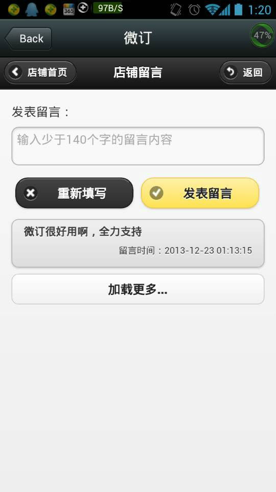 顾客留言功能发布啦!实现了商家与顾客的完美互动 admin 发表于 2013-12-23 14:36:39 顾客留言功能发布啦!顾客可以在手机微信店铺留言板进行留言,商家可以在微订系统后台查看留言或者手机短信查看留言,并且能即时回复信息给顾客,顾客可以在手机微信店铺里看到商家的回复,同时也可以在手机短信上接收到回复信息,真正的实现商家与顾客的完美互动。