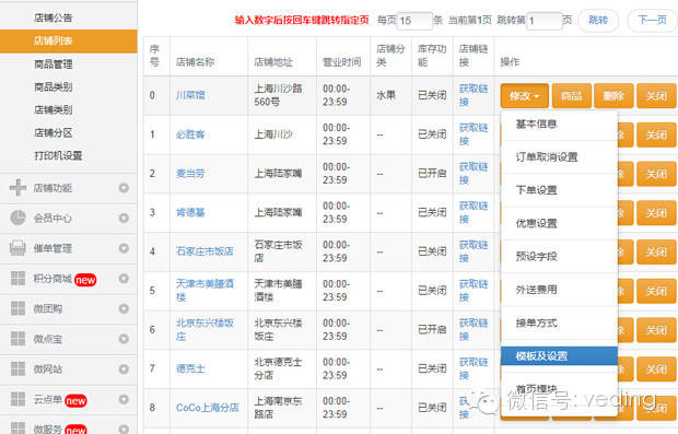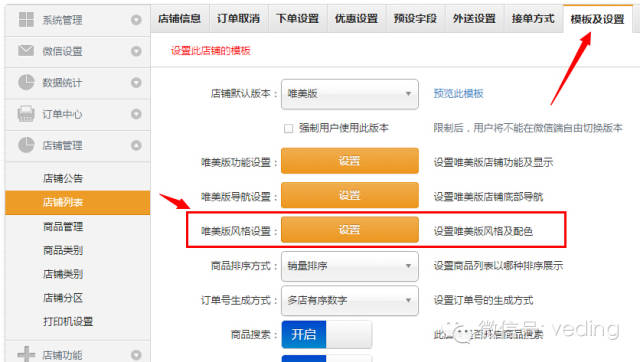 首先,登录微订后台,店铺管理——店铺列表——修改,找到“模板及设置”。如下图所示: