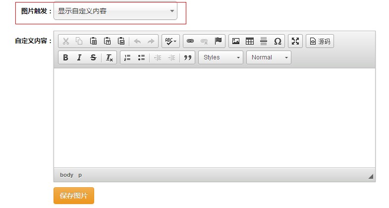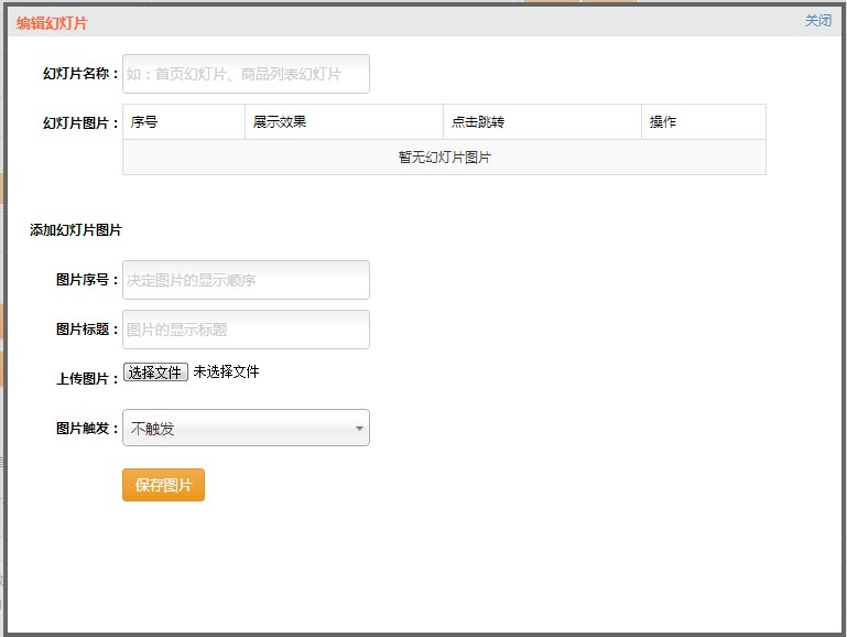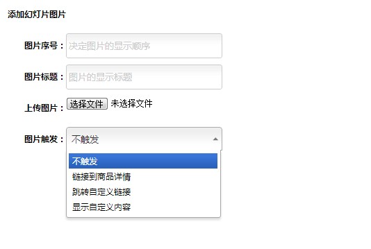 二、然后点击新建幻灯片出来以下界面: 此页面需要你上传相应的图片,然后填写图片的相关信息,如点击此图片是跳转到哪里,图片的显示顺序如何等等: 填好上面的信息,其中图片触发就是点击图片跳转到的地方,这也是此功能非常强大的地方,全面覆盖了商家的所有的需求,不管您是要用幻灯片来来展示商品,还是发布信息,都可以让你随心所欲。如图,点击图片触发方式您可以做如下选择: 选择不触发,则点击图片无反应,只是一个展示。 当您选择链接到商品详情,系统会让你选择需要跳转的商品。 当您选择自定义链接,你需要手动输入跳转的链接。 当您选择显示自定义内容,系统将有显示一个编辑框,让你自由的编辑显示内容。 如以下图所示: