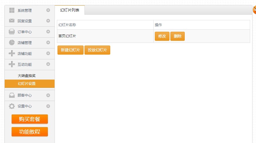 一、首先商家登陆到微订的系统后台,找到互动功能——幻灯片设置: 此页面主要是先新建幻灯片,就像当初的图片素材一样,先新建素材,然后投放到各个店铺的页面上,点击以下的新建幻灯片: