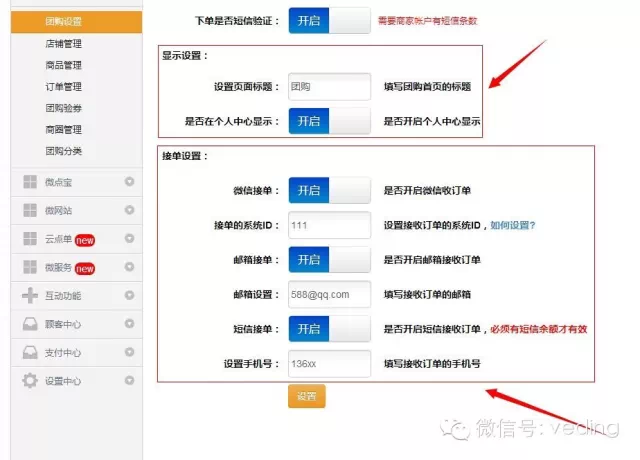 2、微团购新增显示设置和接单设置功能,完美支持微信,邮件,短信接单方式。