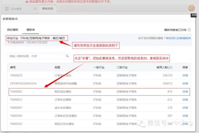 | 模板消息功能上线啦! admin 发表于 2014-10-30 02:31:48 模板消息功能上线啦!模板消息功能是什么功能呢?是微信推出的用于认证服务号向用户发送重要服务通知的功能,例如,向下单成功的用户发信息,订单确认后向用户发信息,付款成功后向用户发信息等。安全快速的提醒用户,摆脱传统的电话通知,短信通知方式。认证的服务号就可以发消息提醒用户了,使用效果良好,用户体验极强,第一时间提醒您的用户。 现该功能完美的运用于微订系统订单提醒功能中,为客户跟踪订单提供了便捷。用户再也无需打电话询问订单的状态了,公众账号随时告诉您! 商家需要如何设置呢?首先商家公众账号必须是认证的服务号,在微信公众平台后台找到“模板消息”功能(此功能需要向微信提交申请),点击进去选择对应的行业类别,在模板库中获取到相应的“模板消息ID”填入微订系统后台,如下图所示: