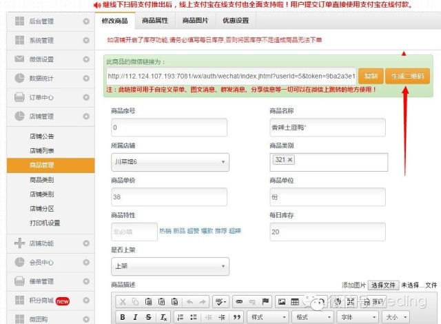 商家可以在店铺管理,商品管理,新建商品或者修改商品中为此商品生成二维码。如下图所示: