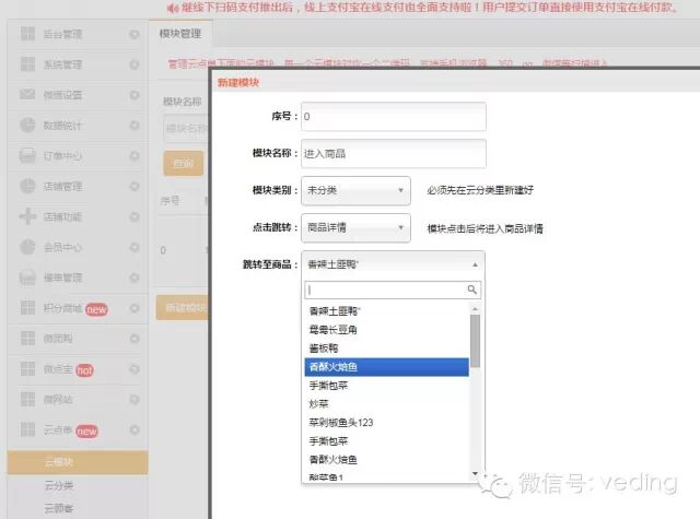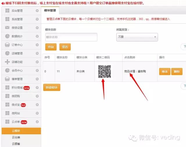 还可以直接在“云点单”板块中新建商品模块,设置模块名称,跳转到“商品详情”,要跳转的商品。如下图所示: 上一条:会员系列功能升级 下一条:新增配送时间预设字段功能 免责声明:部分文章信息来源于网络以及网友投稿,本网站只负责对文章进行整理、排版、编辑,是出于传递更多信息之目的,并不意味着赞同其观点或证实其内容的真实性,如本站文章和转稿涉及版权等问题,请作者及时联系本站,我们会尽快处理。 责任申明:官方所有内容、图片如未经过授权,禁止任何形式的采集、镜像,否则后果自负! 标题:完美支持生成商品二维码 地址:https://www.veding.com/static/v2/notice/398.html 相关资讯