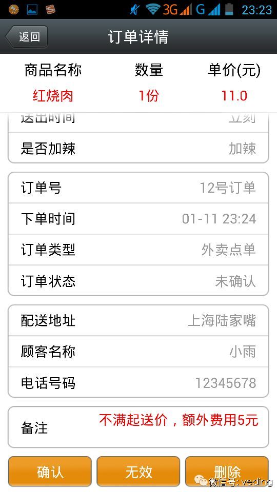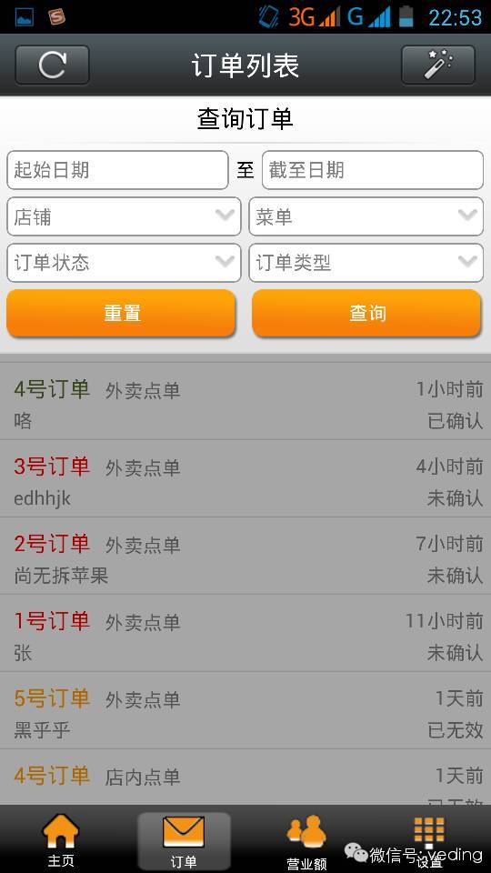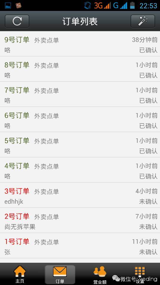 2、微订系统手机端最实用的功能还要属订单处理功能,也就是说微订商家可以通过手机端软件接收最新订单,并且可以手机上确认该订单是否有效(为此工程师还对订单进行了颜色的区分,红色表示未处理订单,绿色表示已确认订单,橘黄色表示无效订单),省去了PC端操作的麻烦只需拇指轻轻一按方能完成订单确认。 3、商家还可以进行订单查询,多条件筛选查询,比如查询某个店铺的订单,查询某个时间段的订单都可以的,是不是很便捷呢。