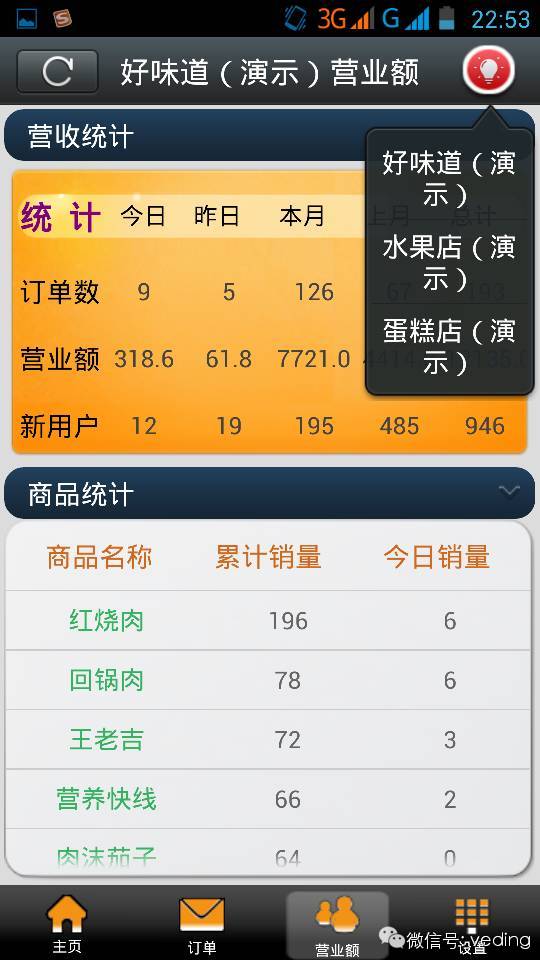 4、除了以上所说的订单确认查询功能之外商家还可以查看营业额统计,海量的营业数据同步手机端,走到哪儿看到哪儿,无需登陆电脑查看数据。商家还可以按店铺查看营业数据,是不是很酷哦!