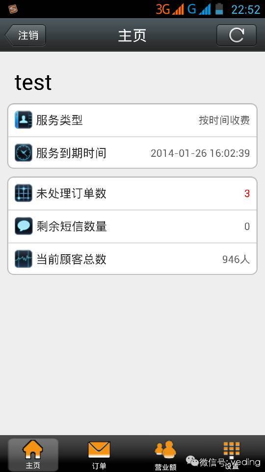 微订微信点餐系统手机客户端商家版上线啦! admin 发表于 2014-01-12 13:00:39 经过数星期的奋战,我们的工程师们终于完成了微订商家版手机端的开发,也就是说商家只需下载手机端app安装在手机上就能像电脑一样的操控微订微信点餐系统后台了!是不是觉得很实用呀,那么微订手机app到底有哪些功能呢?看看就知道 1、商家安装微订系统手机端后就可以查看到账号的信息,例如账户到期时间,未处理订单的数量 剩余短信条数,以及当前的顾客总数等功能,和微订系统PC端的效果是一样的,是不是觉得方便了许多呢?