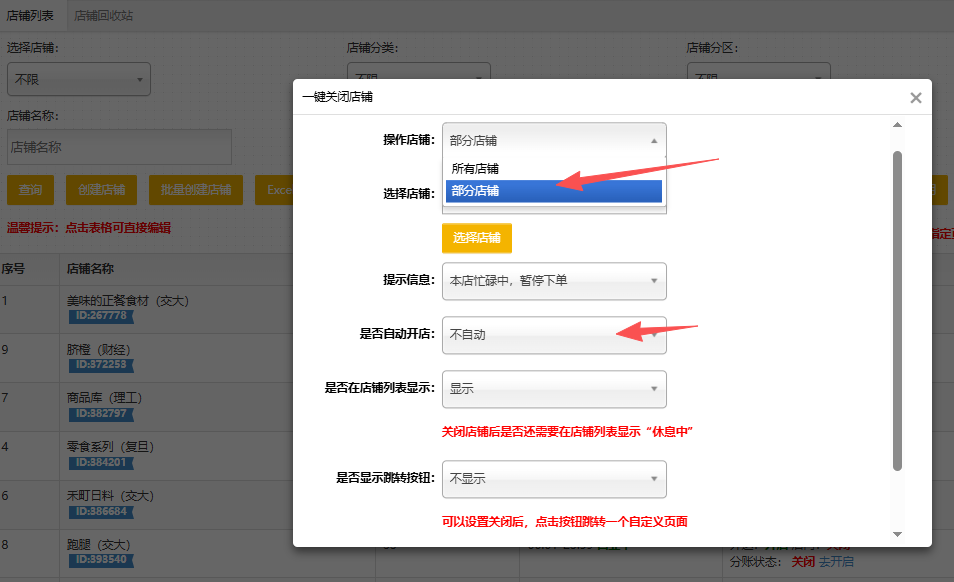 操作方式:商户-店铺管理-一键开关店铺-部分店铺