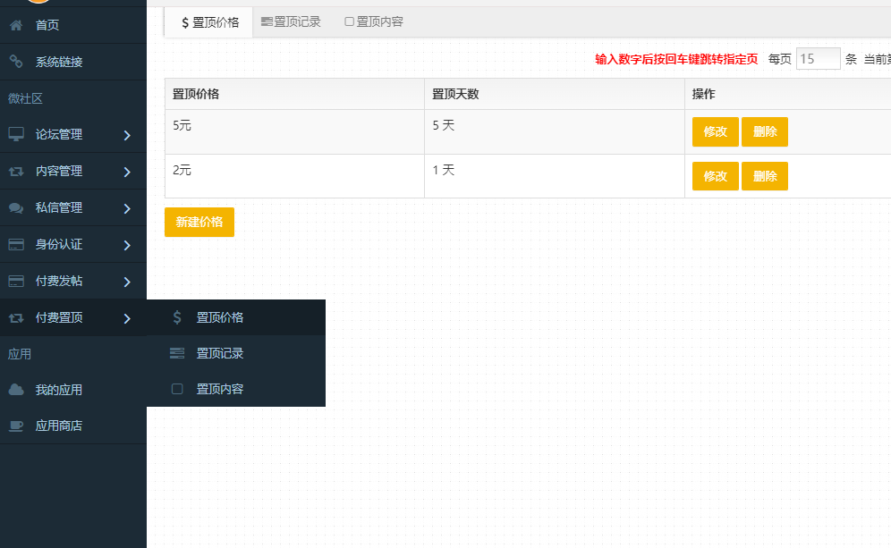 | 微订微社区论坛系统12月4号更新说明 admin 发表于 2025-12-04 15:45:10 一、论坛发贴功能升级,发贴界面增加了付费置顶购买选项,可以直接选择价格进行付费(之前需要发布之后购买置顶) 设置方法:微社区论坛系统-左侧-付费置顶,创建置顶