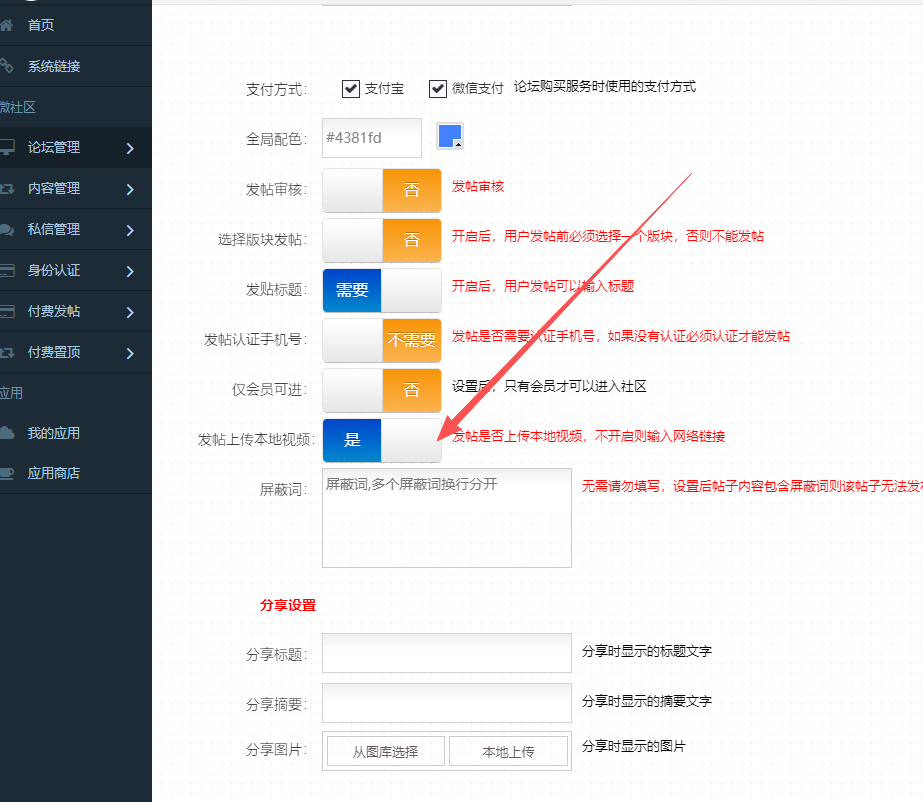 设置方法:微社区论坛系统-左侧-设置-开启上传本地图片