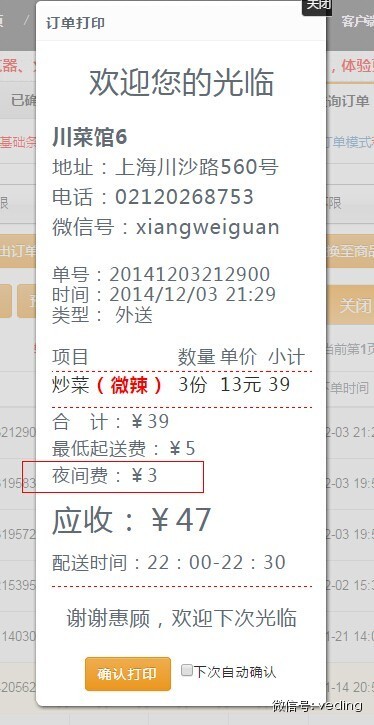 预设字段费用也可以在打印订单中体现出来。如下图所示: 预设字段费用设置,在店铺管理——店铺列表——修改——预设字段——添加预设字段——备填选项中设置。商家可以自定义任何的预设字段的费用,方便结算用户额外费用。