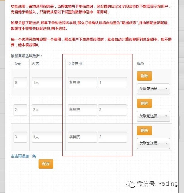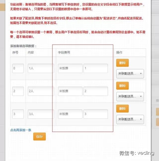 例如,我们经常遇到的配送时间预设字段运用,不同的配送时间配送,其外送费不一样,高峰期配送或者夜间配送费用都是不一样的,那么此功能完全可以满足不同外送费的计算了。还运用于商品的搭配选择方面,例如商家设置不同米饭的预设字段分为:1人米饭,2人米饭,3人米饭,那么其不同的搭配那么费用是不一样的,通过预设字段自定义费用功能可以很好的解决。如下图所示: