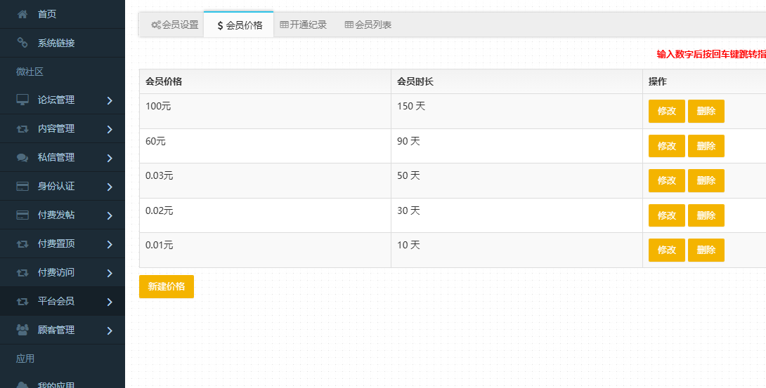 | 微订微社区论坛、同城系统4月3日号更新说明 admin 发表于 2026-04-03 16:19:05 一、重磅更新,微社区论坛增加“论坛会员”功能[同城系统也支持],可以自定义不同时长的会员价格,自定义开启一些会员权益,比如免费发贴几条、免费置顶几条、免费查看手机号、置顶打折等,后续将推出更多会员权益功能