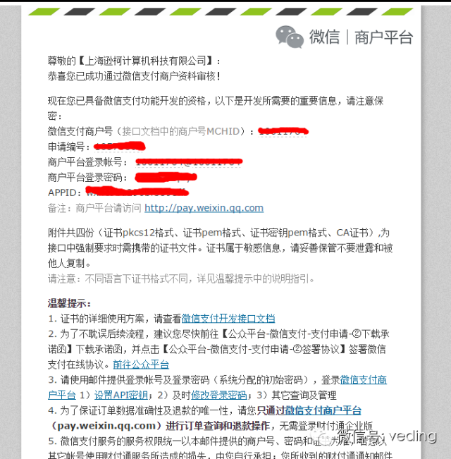 那么,微信支付申请审核通过后,您就可以收到微信发给您的邮件,里面有您账户相关参数: