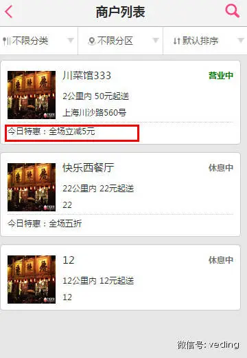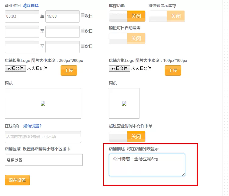 小功能优化升级 admin 发表于 2014-12-12 23:45:02 为了丰富店铺列表信息,吸引用户进店消费,新增店铺描述功能。商家可以在微订后台给每个店铺自定义描述,例如:本店今日全场5折出售等字样,及时直观的展现在店铺列表页面。