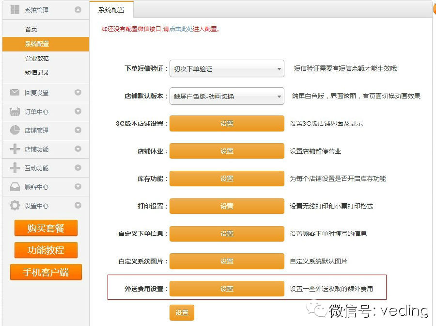 | 外送费用可以额外设定啦,支持自定义费用名称 admin 发表于 2014-01-14 11:43:04 根据很多商家反馈,需要具备设置外卖费用的功能,特此,微订工程师们立即开发了此功能,也就是说商家可以在微订系统后台设置是否需要额外增收外卖费用,此功能解决了外卖难的问题。这次更新满足了大部分外卖商家的需求,是不错的功能哦。 1、首先商家登陆微订系统后台,进入系统管理,点击系统配置,找到“外送费用设置”进行设置如图所示:
