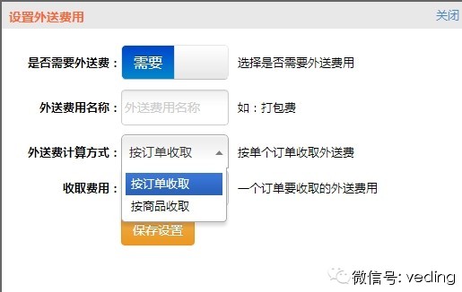 2、开启需要,然后可以自定义外送费名称例如“打包费”“外送费用”都可以的。外送费计算方式有两种:按订单收取,按商品收取,所谓的按订单收取,就是一个订单收取外送费多少钱的意思,而按商品收取就是一个订单内每一个商品需要多少外送费用(如果有什么不明白可以直接问客服)设置如图所示: