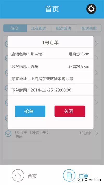 酷炫抢单弹窗页,抢单就是快!配送员点击待抢订单,弹出订单的信息,作出是否要抢单的选择。如下图所示: