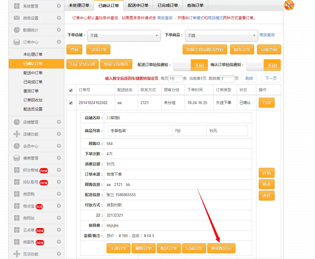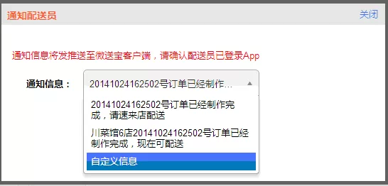 商家还可以通过微订后台给已抢订单的配送发送信息,通知其前往店里取商品进行派送。如下图所示: 商家后台通知配送员前去店内取单将弹窗提示,如下图所示: 上一条:微送宝优化升级,配送员分店铺设计 下一条:小功能优化升级 免责声明:部分文章信息来源于网络以及网友投稿,本网站只负责对文章进行整理、排版、编辑,是出于传递更多信息之目的,并不意味着赞同其观点或证实其内容的真实性,如本站文章和转稿涉及版权等问题,请作者及时联系本站,我们会尽快处理。 责任申明:官方所有内容、图片如未经过授权,禁止任何形式的采集、镜像,否则后果自负! 标题:微送宝,配送员的小秘书! 地址:https://www.veding.com/static/v2/notice/422.html 相关资讯