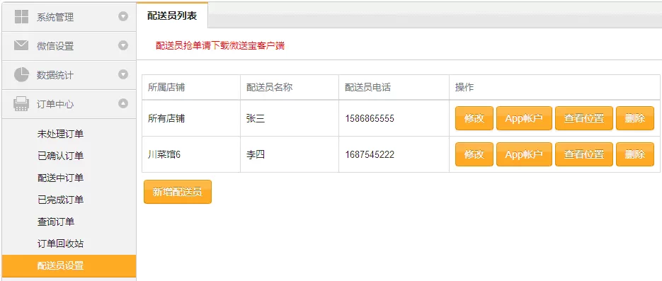 通过以上我们对微送宝有所了解了,那么商家怎么控制配送员的抢单权限呢?商家需要在微订后台对配送员进行设置。在订单中心,配送员设置中设置。在这里商家可以新建配送员,新建配送员app账号密码,设置配送员所属店铺,及时查看配送员所在位置。如下图所示:
