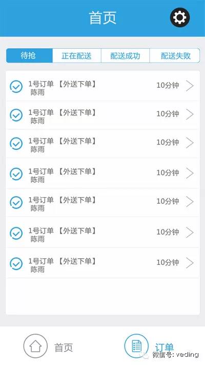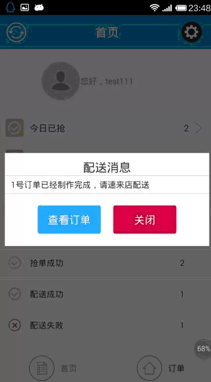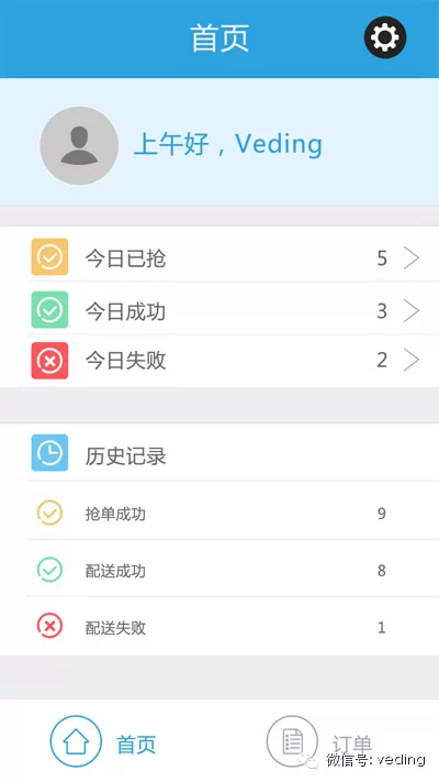 首页订单统计详细、精准。可以准确的统计出已抢订单,配送成功订单,配送失败订单等数据,方便配送员统计。简洁时尚的的首页统计界面,让你倍感舒心。数据统计精准、无误,配送员一看便知。如下图所示: