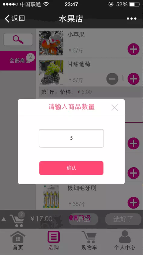 1、商品选购支持手动输入数量(此功能只支持唯美版)。为了方便用户批量选购商品,我们推出手动输入商品数量功能,无需一个一个的点击+号来选购了,方便快捷。此功能对于水果,零售店颇为实用。 用户只需点击+号,然后点击中间的数字便可进入数量输入框界面,轻松输入对应的数字。如下图所示: