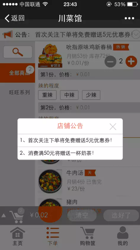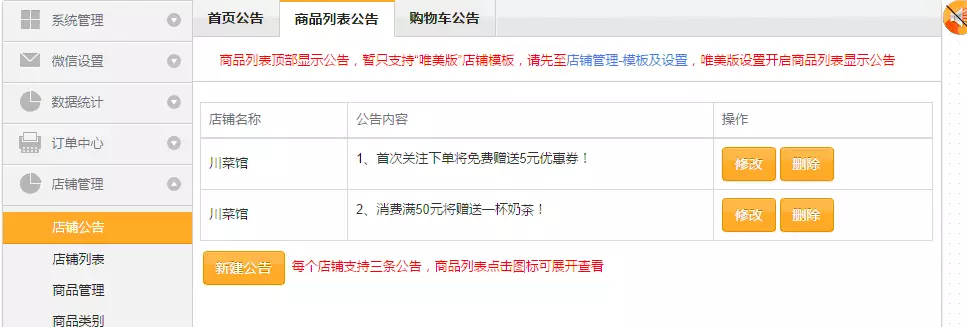 商家在微订后台新建多个公告。如下图所示: