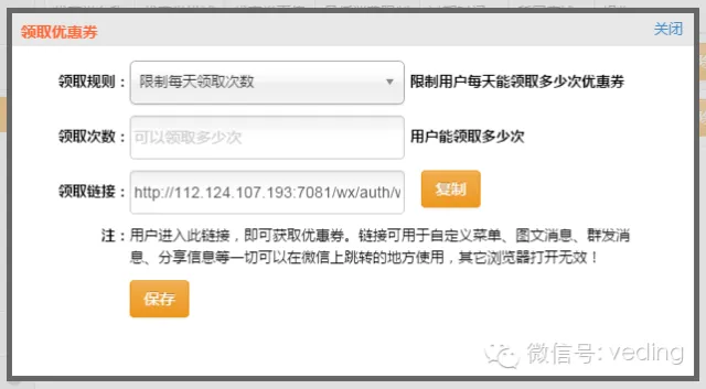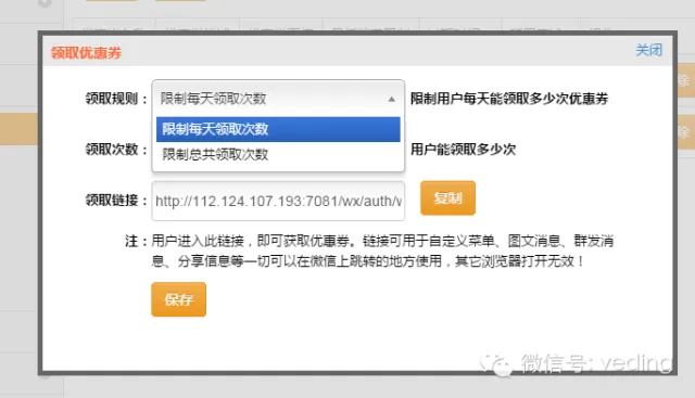 新增优惠券领取和首次下单立减金额功能! admin 发表于 2015-03-21 00:22:39 我们都知道优惠券是商家常用的营销利器,它有助于提高顾客的兴趣,刺激顾客对商品的试用欲望;可对扭转商品或服务全面下跌的局面起到一定的作用,并协助加强弱势品牌的销售量。为了充分利用优惠券的营销价值,除了商家可以主动发送优惠券给顾客之外,还可以让顾客自动领取优惠券,让其更加灵活的运用于微信点单中来。这样优惠券的价值就得到了充分的利用,从而提高顾客的兴趣。 商家可以在微订后台新建一个虚拟的优惠券,将优惠券的获取链接放置需要的地方,供顾客自己点击进入领取优惠券。例如可以将此链接放置自定义菜单,图文素材,微信公众平台群发消息中去。方便灵活的将优惠券赠送给消费者!如下图所示: 商家在微订后台新建优惠券。如图所示: 点击优惠券右边的“领取优惠券”进入领取优惠券的设置。如下图所示: 可以限制顾客每天领取优惠券的次数或者限制总共领取次数。然后将领取链接复制到自定义菜单,图文素材,微信公众平台群发消息等地方去。如下图所示