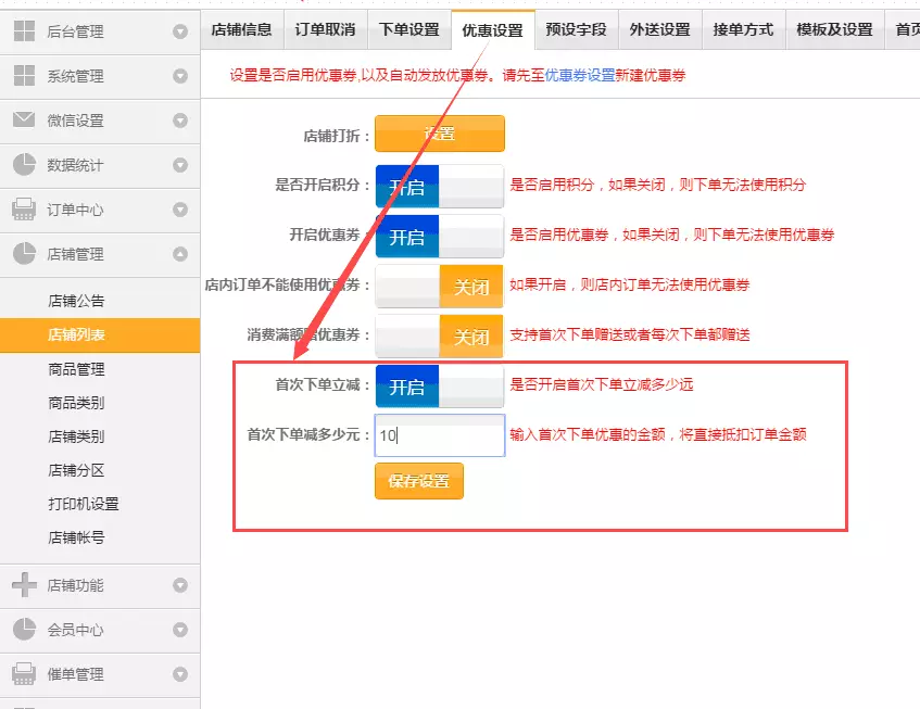 商家设置,店铺管理——店铺列表——修改——优惠设置——首次下单减多少元,输入对应的金额即可。如下图所示: