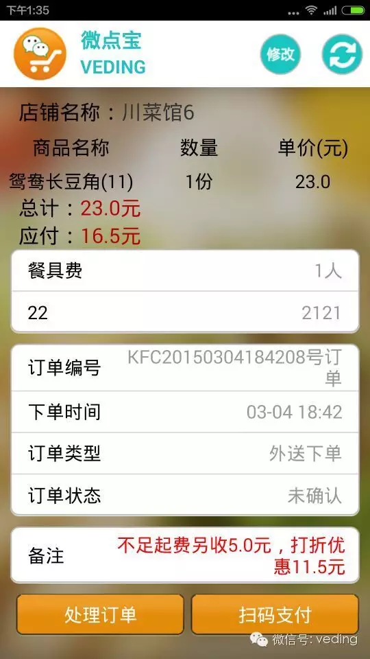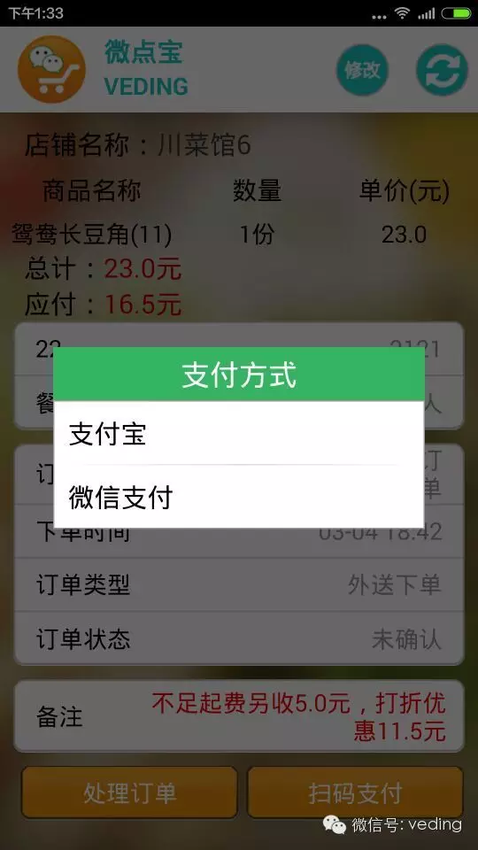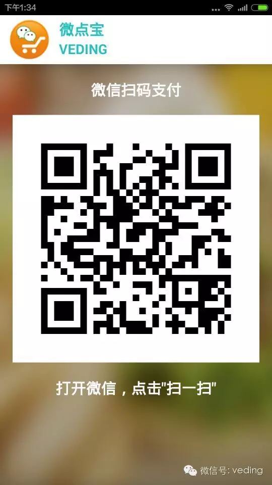 微信扫描支付的只需以下简单几步:顾客下单→→商家打开订单二维码→→顾客打开微信扫一扫进行支付→→完成支付。是不是很方便呢?更加强大的是支付二维码已经同步于微订商家客户端,微点宝,微送宝,微订系统后台等地方。商家在任何时间,任何地方都可以生成一个订单二维码供顾客微信扫描支付了!