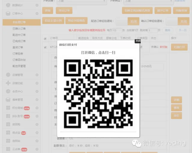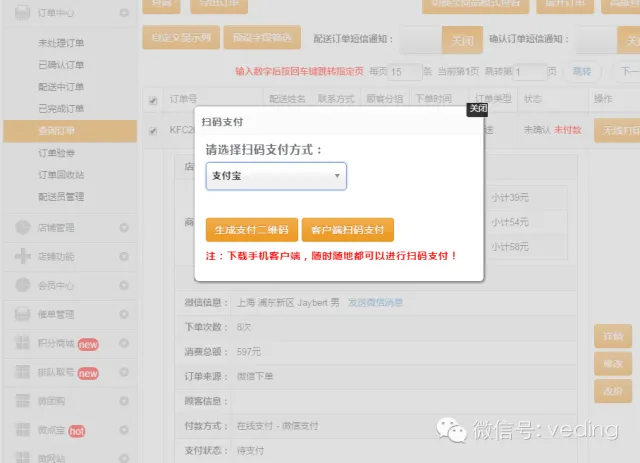 微订商家手机客户端,微送宝,微订系统后台同样也是一样的操作。 微订后台订单中心,找到订单,点击“扫描支付”,如下图所示: