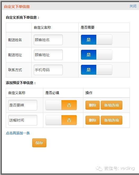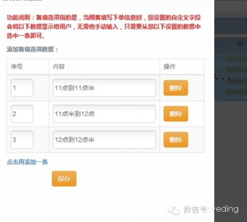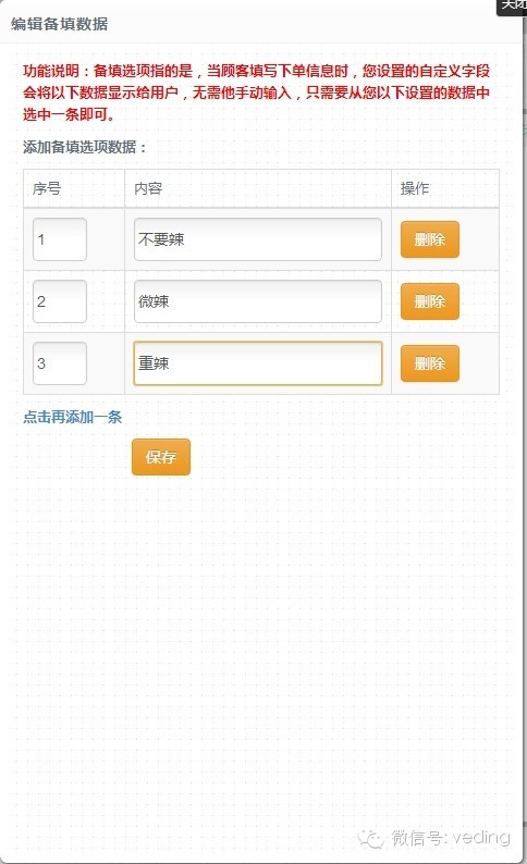 2、在自定义下单设置中新建一个字段“是否加辣”,然后选择该字段的“备填选项”如图所示: 我们还可以新建一个“送餐时间”然后新建备填选项“11点到11点半”“11点半到12点”“12点到12点半”等等商家都可以自己拟定。 3、商家在后台设置好了备填选项之后,顾客只需在提交订单的时候进行选择即可,方便快捷无需输入,如图所示: