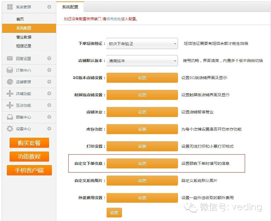 1、首先商家进入微订系统后台,选择系统管理中的“系统配置”进行自定义下单设置。