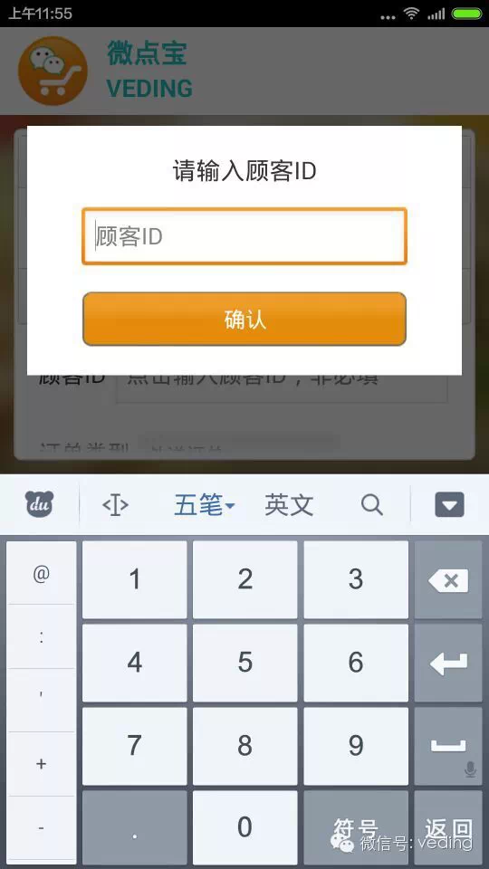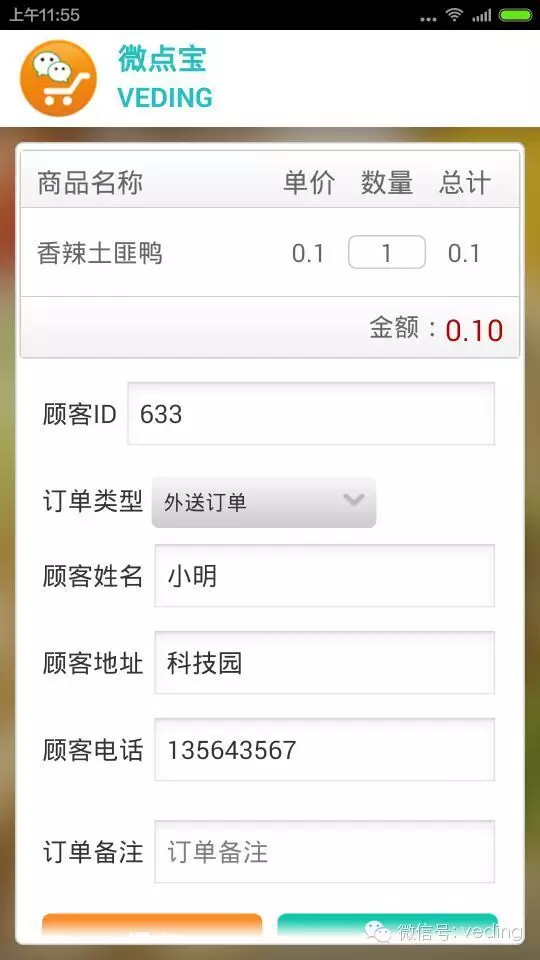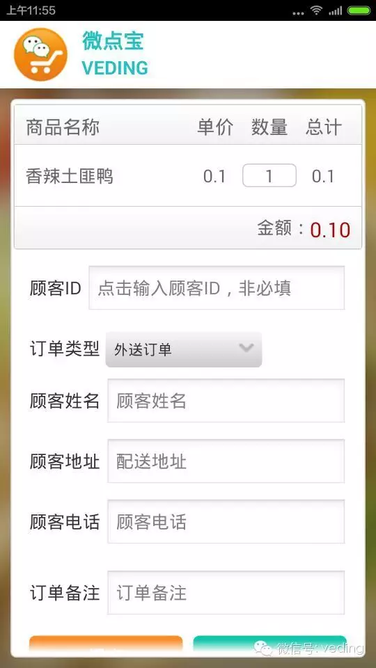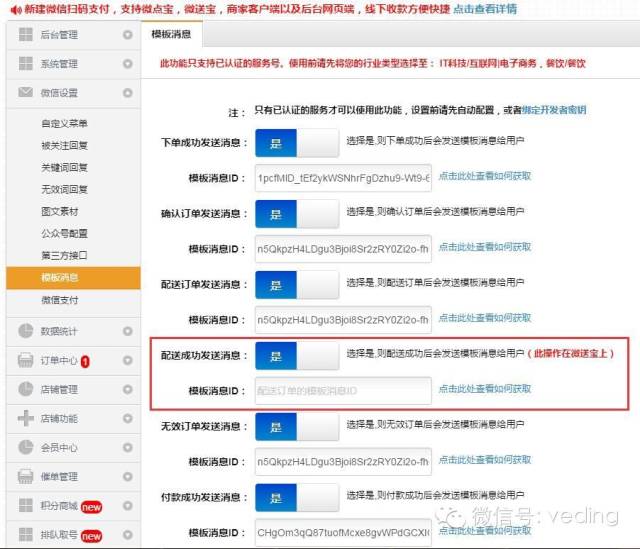 新增配送成功的模板消息。配送员通过微送宝客户端完成订单配送之后,微信将发送配送成功的信息给用户。模板消息需要认证之后的服务号才能使用,如下图所示设置: 微点宝支持输入顾客ID。为了方便商家管理顾客,我们在微点宝客户端新增了顾客id的输入,这样在订单中就可以体现哪个顾客下的订单了,也可以对该顾客进行积分,优惠券的奖励了。如下图所示: