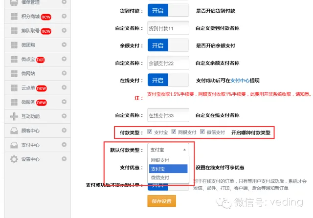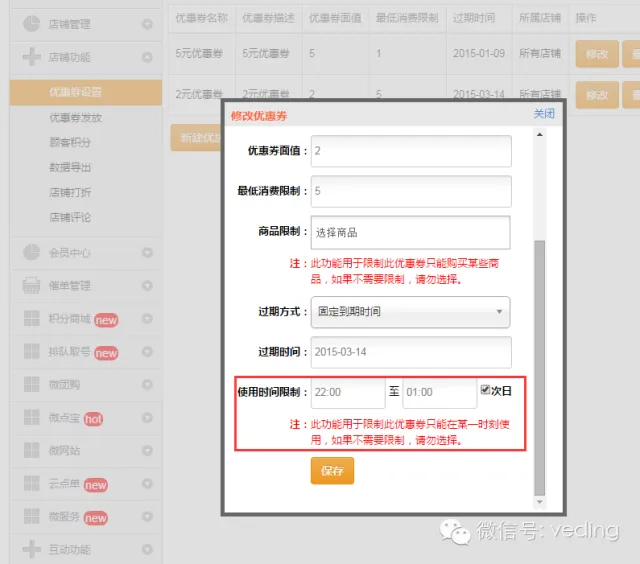 优惠券增加使用时间限制。商家可以限制优惠券的使用时间段,例如5元优惠券只能在中午22:00-01:00使用,那么就可以通过此功能实现。如下图所示: 支持设置默认的支付方式。在线支付我们分支付宝支付,网银支付,微信支付,通过后台可以设置一个默认的支付方式,例如我们商家想要用户默认使用支付宝支付,那么就可以在后台进行设置了。如下图所示:
