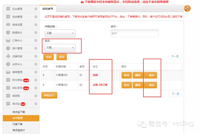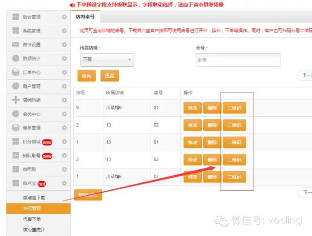 商家首先要在微订后台,微点宝板块,台号管理中设置好桌号,并且可以在桌号后面获取到相应的二维码,将此二维码粘贴到指定的桌位上,顾客通过扫描就可以直接占用此位置进行店内下单。如下图所示: