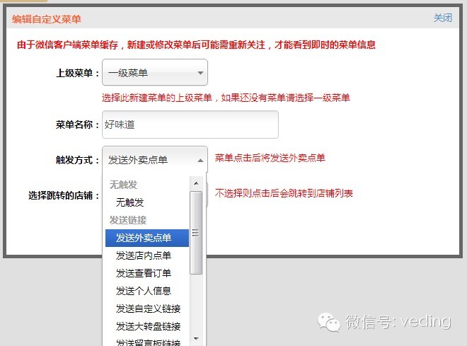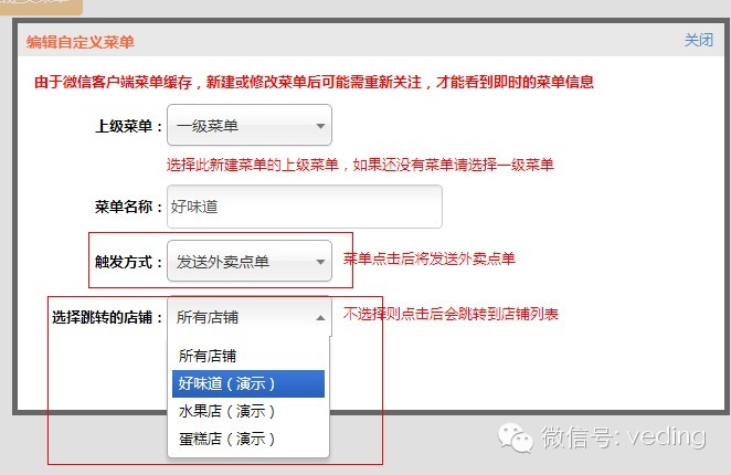 自定义菜单和图文素材可指定跳转到具体店铺 admin 发表于 2014-01-20 00:31:37 之前自定义菜单和图文素材的触发方式当您选择跳转到外卖点单时,是默认先跳转到店铺列表,用户还需要重新选择一下店铺,才能进入点单。经过多个商家提议,多店铺应该直接跳转到具体店铺,让用户更方便的进入点单,因此添加了触发时选择店铺的功能,一起来看看吧。 1、商家在微订系统后台设置“自定义菜单”时,选择菜单的触发方式之后进行对应的店铺选择,如图所示: