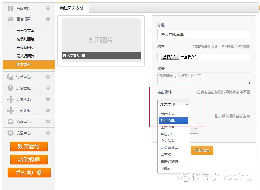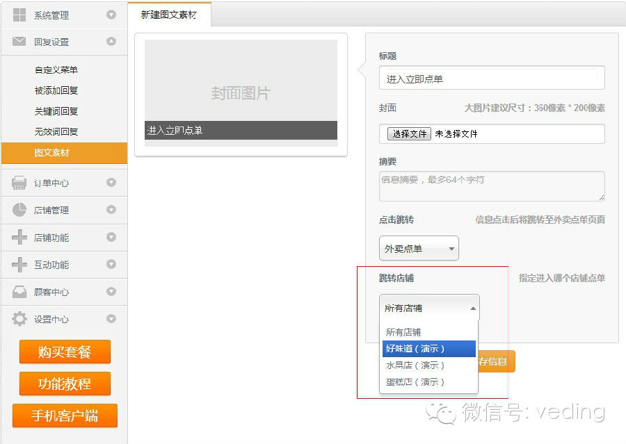 此次主要是对部分小功能的完善,此功能对多店铺的商家来说是福利,让跳转更加灵活,使用起来更加方便!同时也很感谢这几个商家的建议,让我们系统更加完善的同时,也给用户带来了便捷。微订承诺:只要是好的建议,我们都会采纳,并迅速的解决商家的疑虑,让大家更放心的使用微订系统。 免责声明:部分文章信息来源于网络以及网友投稿,本网站只负责对文章进行整理、排版、编辑,是出于传递更多信息之目的,并不意味着赞同其观点或证实其内容的真实性,如本站文章和转稿涉及版权等问题,请作者及时联系本站,我们会尽快处理。 责任申明:官方所有内容、图片如未经过授权,禁止任何形式的采集、镜像,否则后果自负! 标题:自定义菜单和图文素材可指定跳转到具体店铺 地址:https://www.veding.com/static/v2/notice/50.html 相关资讯
